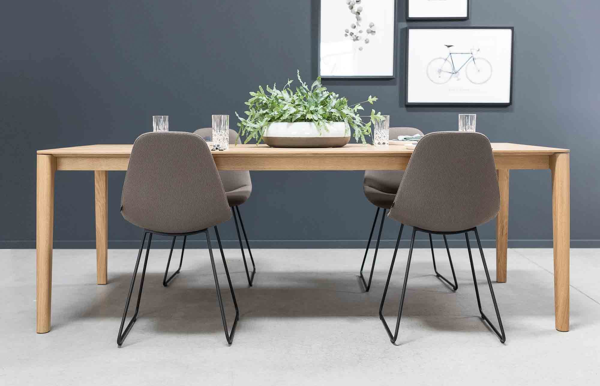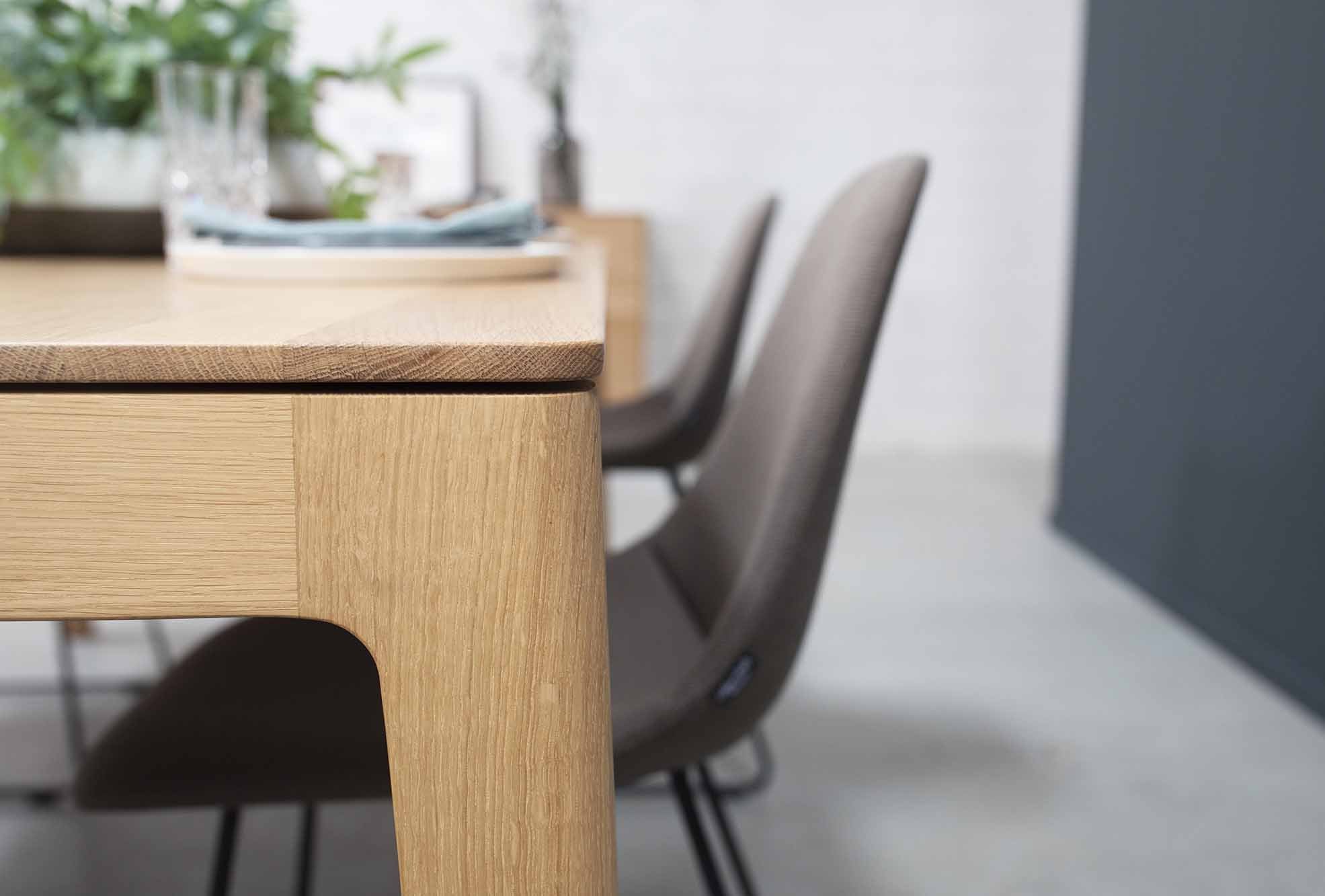 Solide gebaut und trotzdem eine filigrane Erscheinung – FRIEDRICH+ lebt von einer modernen und feinen Linienführung. Leicht ausgestellte Füße, organische Rundungen und eine dünne Sichtkante der Platte prägen das Design.