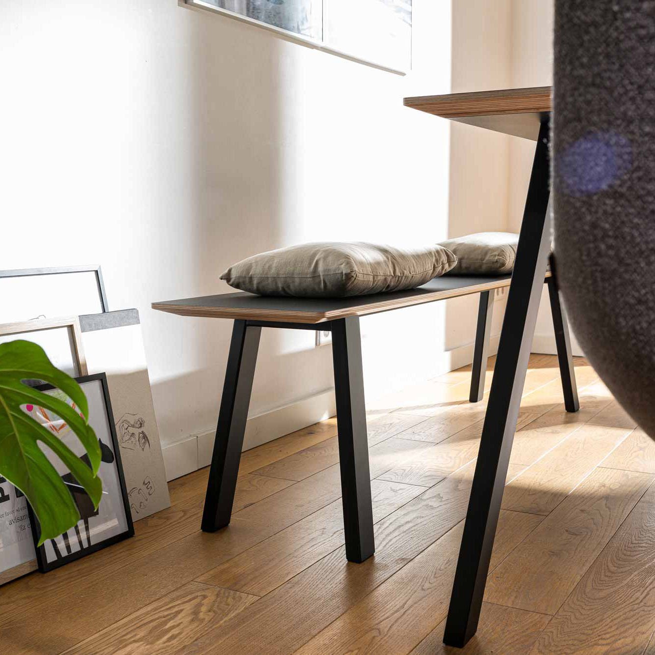 25 mm starke Wildeiche Massivholz Bankplatte mit schweizer Kante. 10mm Sichtkante. Oberfläche fein geschliffen und mit natürlichem Holzöl versiegelt.Stabiles, in Classic Black beschichtetes Gestell aus 60 x 30 mm Stahlrohr.