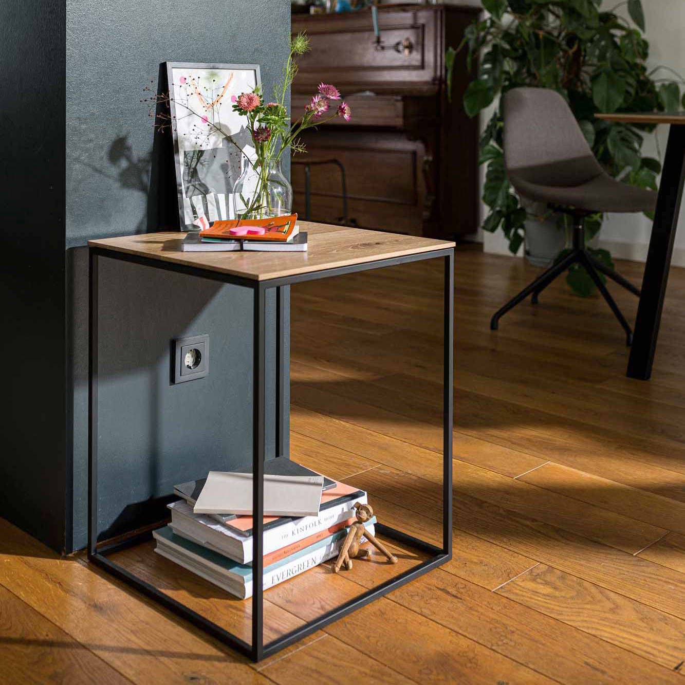 Beistelltisch AMAT vereint ein filigranes Metallgestell mit hochwertigem Massivholz zu einem praktischen Wohnbegleiter. Ob als nützliche Ablage neben dem Sofa oder als puristischer Nachttisch – die geometrische Formgebung machen den Design-Beistelltisch zu einem vielseitigen Gestaltungselement.