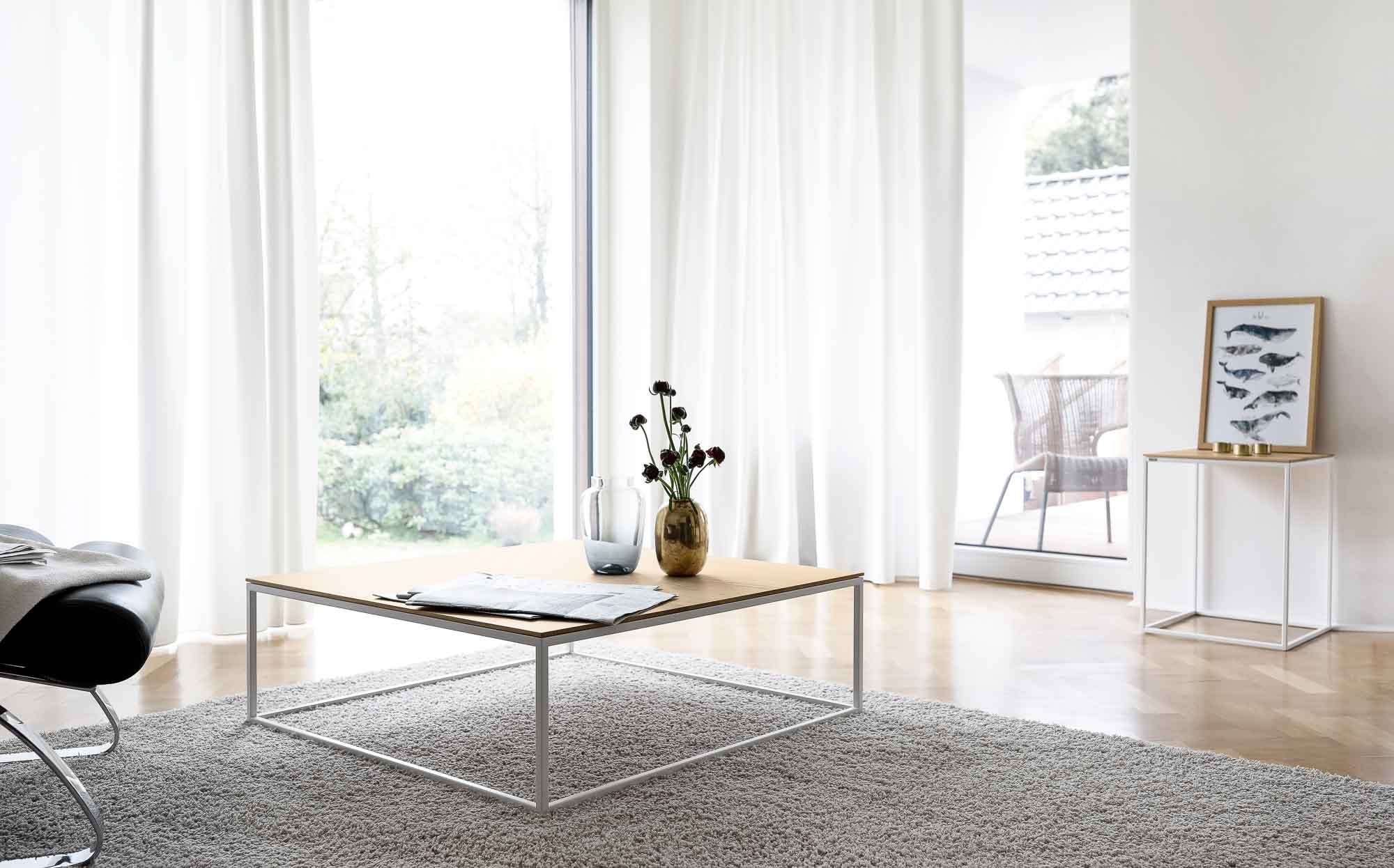 Zeitgemäßes Design konsequent umgesetzt. Couchtisch AMAT verbindet wertige Materialien mit geometrischer Harmonie. Die hauchdünn anmutende Massivholzplatte ruht mit feiner Schattenfuge auf dem filigranen Metallgestell. Dank des kubischen Designs und der puristischen Linienführung, verströmt der Couchtisch moderne Eleganz für anspruchsvolles Wohnen.