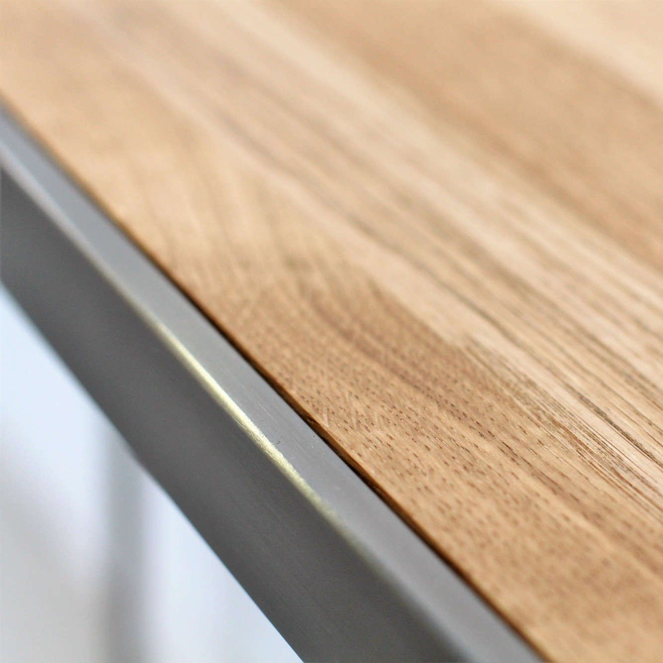 Tischplatte aus zertifiziertem Eichen- oder Nussbaum-Massivholz, 19 mm stark und mit feiner Schweizer Kante. Handgeschweißtes Gestell aus filigranem 30 × 10 mm Rechteckrohr, wahlweise aus gebürstetem Edelstahl oder pulverbeschichtetem Stahl in „Classic Black“.