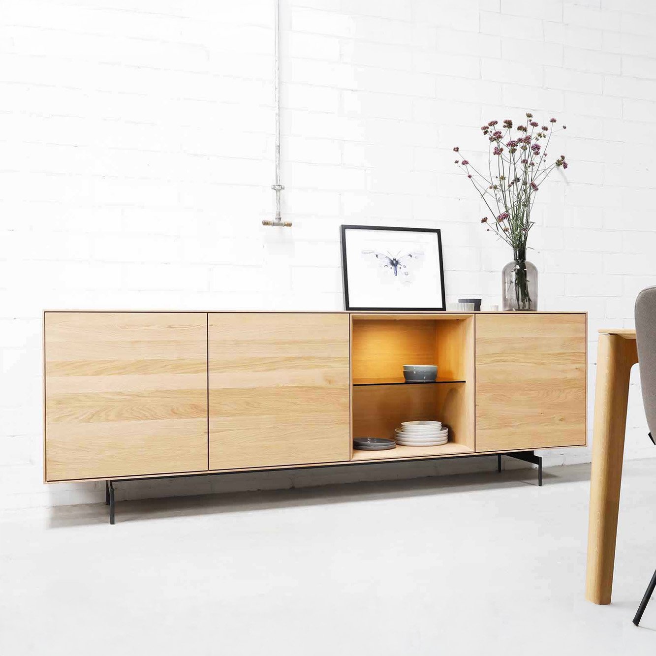 Eine moderne und gleichermaßen zeitlose Formensprache, natürliches Massivholz und eine wunderbar handwerkliche Verarbeitung bis ins Detail. Sideboard FRIEDA ist ein Möbelstück, welches lange Freude bereitet – dies nicht zuletzt durch die geölte Massivholzoberfläche, welche neben einer schönen Haptik auch eine gute Reparierbarkeit mit sich bringt.