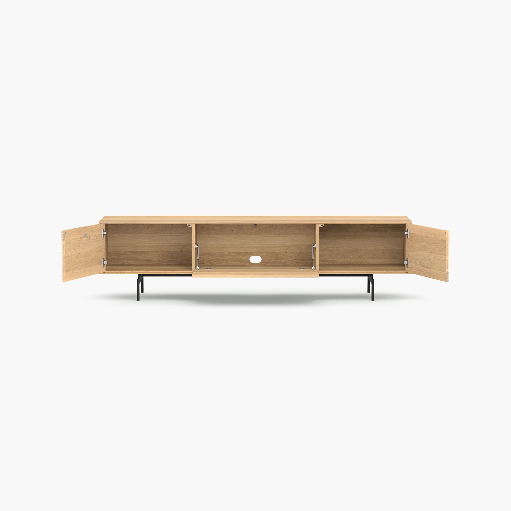 Korpus & Fronten aus Massivholz mit geölter Oberfläche. Wahlweise in Eiche, Wildeiche oder amerikanischem Nussbaum. Rückwand aus furniertem Schichtholz. Füße wahlweise aus Schwarz pulverbeschichtetem Stahl, oder aus Edelstahl mit fein geschliffener Oberfläche.