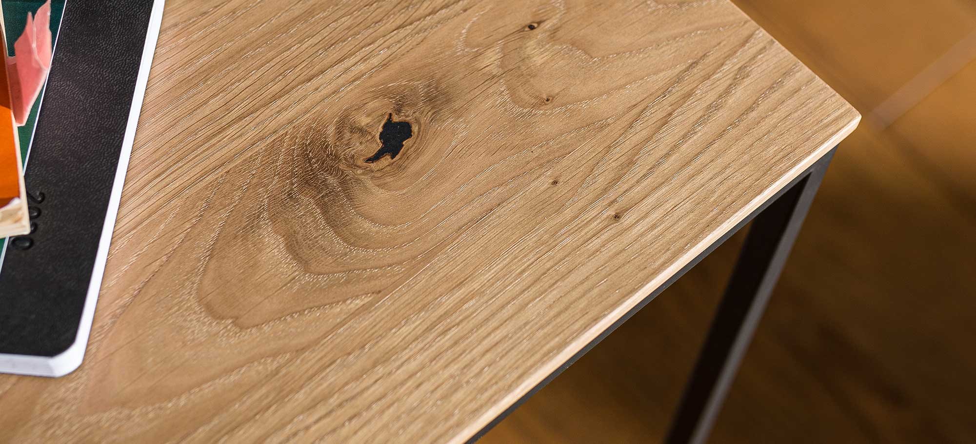 Jede Wildeiche – Massivholzplatte ist ein reines Naturprodukt und einzigartig. Je nach Baum, fällt das Holz mal etwas heller, mal etwas dunkler, mal mit sehr vielen Astlöchern, mal mit weniger Astlöchern aus. Unsere Schreiner achten dabei aber stets auf ein harmonisches Gesamtbild jeder Massivholzplatte. Beachten Sie, dass kleinere Risse ganz normal und Zeichen der Natürlichkeit sind.
